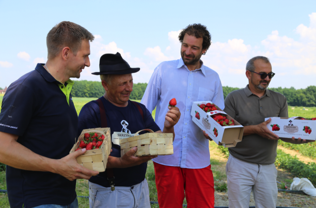 - Ten sezon jest trudny dla uprawy porzeczki. Wiosna była bardzo zimna. Na początku kwitnienia temperatury w dzień wynosiły 13C a w nocy 4C. Amplituda była więc duża. Pojawił się problem z osypywaniem owoców. W gospodarstwie stosowane są innowacyjne metody ochrony i nawożenia, dlatego tych „przestrzelonych” gron nie ma. Jakość owoców oraz plon są na wysokim poziomie. Potem nastały dużo cieplejsze dni, pojawiły się opady deszczu, jednak takie większe (40 mm w ciągu 10 godzin) wystąpiły kilka dni temu. Plantacja jest nawadniania, ale system uruchomiono, kiedy temperatura przekraczała 30C – mówił dr Piotr Baryła.